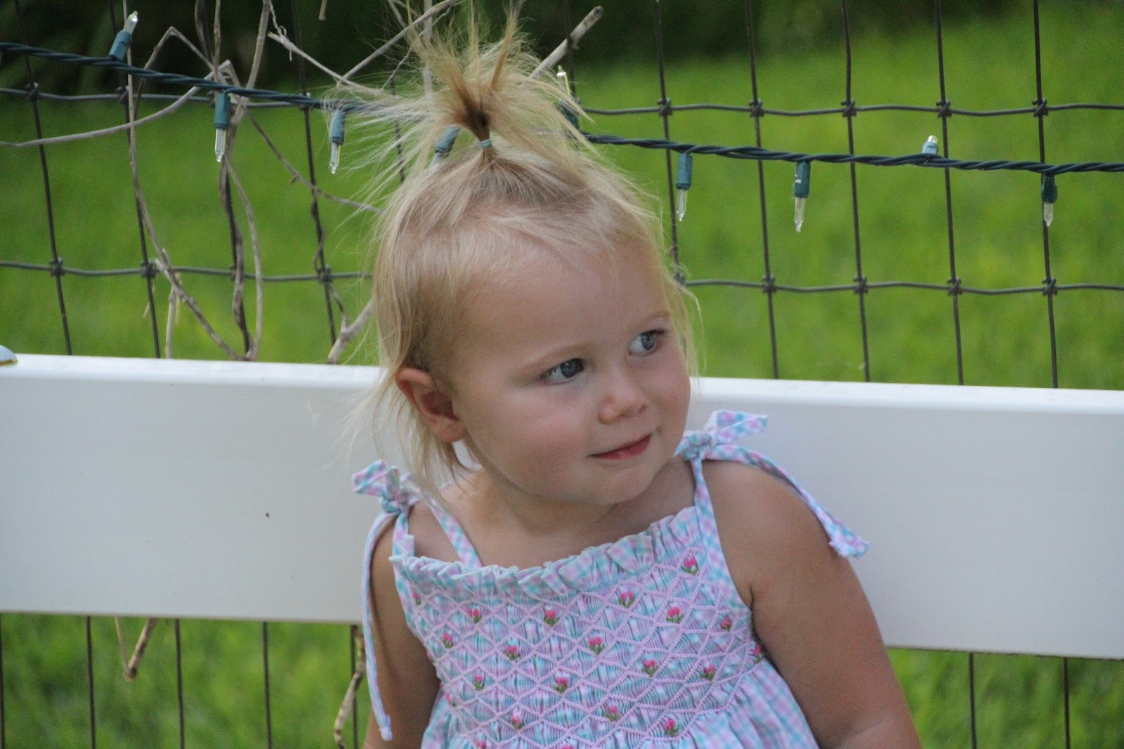 Our big girl is 22 months and growing up fast! She's still 35 inches tall but is now 31.2 lbs (up from 30.2 last month)! She's getting harder to carry around for any length of time, even though I love to hold her and she still runs to me with her arms up wanting up. She also claps her hands when she wants/needs me. She's coordinated for her age and loves to run everywhere she goes, especially in the house. She's still working on shaking her head up and down for "yes" and does it about half the time, although she'll often say "no" for something when she really means "yes." Her hair is finally growing and we've been able to pull it into pigtails in the past week! We still do the "fountain of hair" more often than not because it's easy and when her hair is in pigtails, it tends to fall and get in her eyes still.