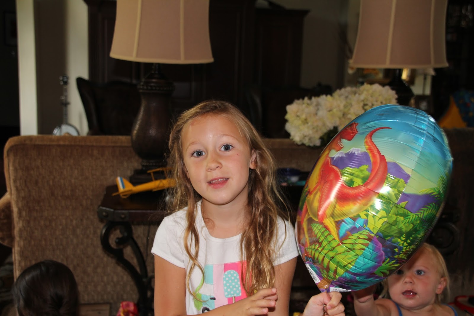 Sofia with her favorite dinosaur birthday balloon