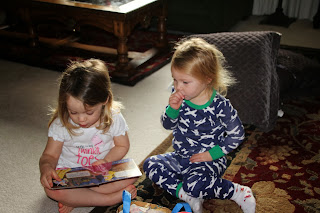 The cousins had a fantastic time playing and being together. Once Chandler, Jillian and Jackson arrived on Wednesday afternoon, Sofia and Olivia immediately wanted to hold "the baby" who they both adore. Sofia held Jackson first and then Olivia before we convinced them both to go play with Chandler and Jillian. The four older kids ran off and had hours of fun over the next few days bouncing and acting silly in the bounce house. Each night before bed, Sofia would read her books to Chandler and Jillian, which was so cute to watch. In the morning, Sofia would usually be the one sitting on the couch holding Jackson and both looked so content. If he got fussy, she would use her rubber band bracelet to entertain him and he'd calm down. The cousins also sat at their own little table for breakfast, which was really cute and worked better than expected. On the last night together, they came up with a story and played in the living room with Sofia and Chandler as the "king" and "queen," Olivia as "Lily" and Jillian as "Silly" who were both the princesses. Their story went on and on and they were having such a great time playing together without running around which was nice. They had such a great few days together and we look forward to seeing Chandler, Jillian and little Jackson again soon.