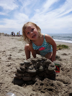We walked the short distance to the beach and set up chairs and towels while Sofia ran straight into the water. Olivia was even interested in walking into the water without being afraid. The beach had some great rocks and tide pools that were perfect for exploring. The girls and I climbed on the rocks and I showed them little crabs, sea enemies, mussels and other ocean life. There were a lot of mussel shells and Sofia, our little collector, started collecting the best ones. Olivia had a hard time negotiating the rocks and wasn't as into exploring as she was just wanting to be with me. Finally we returned to Mike and Becky and Sofia swam while Olivia played in the sand. At one point a group of girls SOfia's age walked by and she followed them back onto the rocks and made a little friend. Her new friend and she were two peas in a pod and were very busy exploring and collecting "treasures" including a huge piece of wood. Both girls' hands were so full of rocks, shells, wood, etc that they didn't have any way of using their hands on the rocks while the walked. They had a ball and were exploring for well over an hour. Finally they returned to the beach side and Sofia swam after having some crackers and a bubble gum popsicle, which Olivia had already eaten (and dropped in the sand a few times). Olivia really enjoyed playing in the sand and going into the water a little bit. Finally it was time for us to get going since we had dinner plays at 6pm at John and Lynn Seigel-Boettner's house in Santa Barbara.