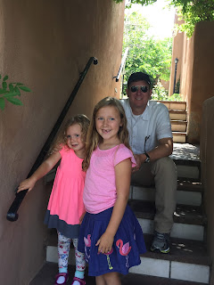 On Sunday we decided to go for a hike up in the mountains, which we normally do when we visit at Thanksgiving but haven't done during the summer since before Olivia was born. We met up with Aunt and Uncle and walked to the Plaza Cafe for a delicious breakfast. After, we hung out on the Plaza and the girls danced while listening to a woman pay her violin. They had a ball and the woman loved that they kept dropping money into her violin case. Aunt Shirl and I visited the Indian jewelry vendors, which is always interesting since each of their jewelry or pottery is different and unique. After a while, we headed back and loaded up into our cars and headed toward the mountain.