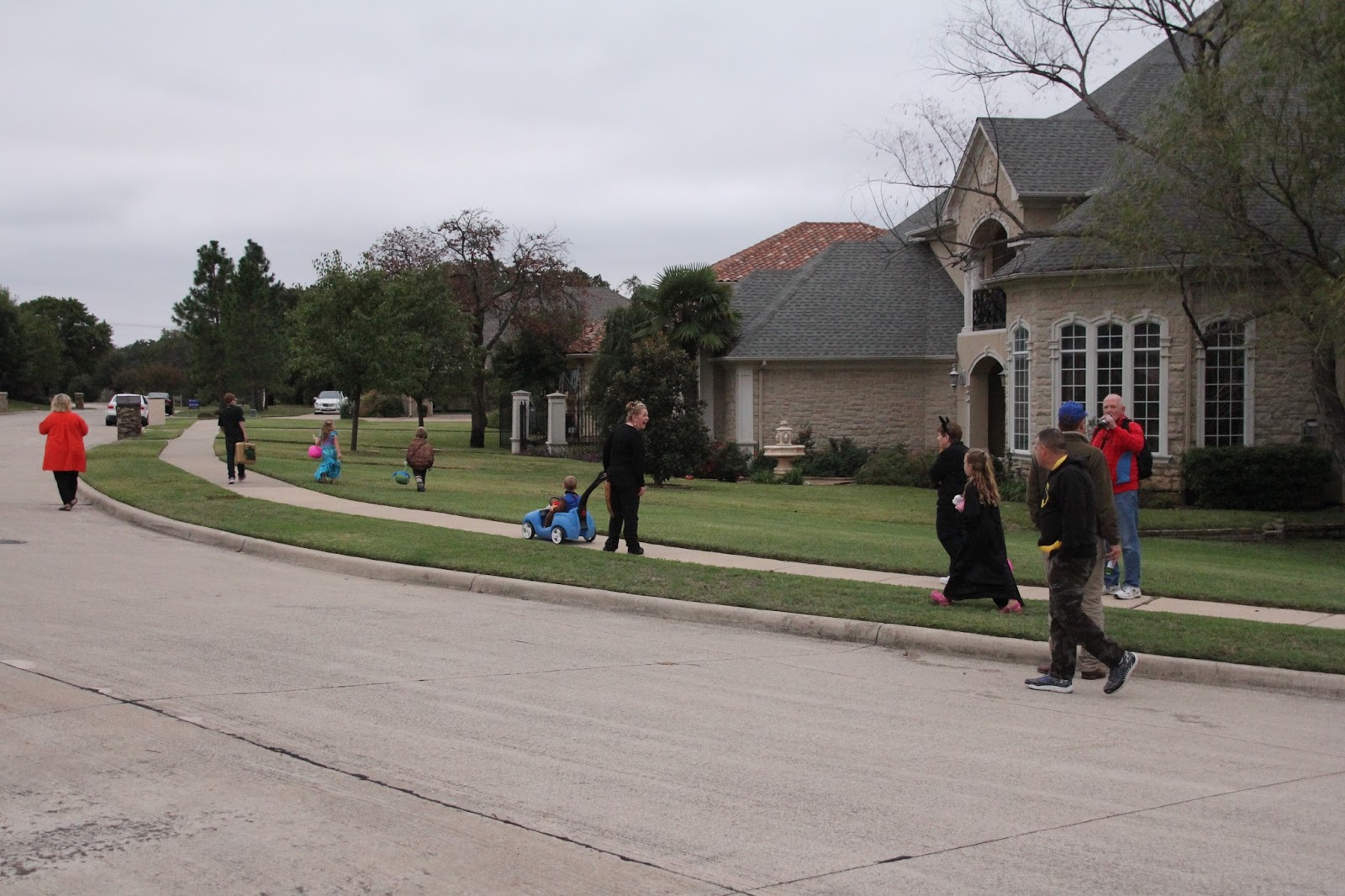 The neighborhood across the street is well decorated for Halloween with about half of the houses having skeletons, ghosts, headstones or purple lights up. Buddy and I take our dog walks through that neighborhood on our way home and it's always fun to see how the houses are decorated. We started on the first house just as it was becoming dusk but no one was home. We moved on to the next house and although we saw other trick-or-treaters out, it didn't seem like it was nearly as busy as past years. About three out of four houses we visited had people passing out candy. Sofia and Brandon stuck together at the front of our group with Dana and I talking behind them, CK and Olivia followed up, with Antonio, Stacy's dad and Marco, and Stacy pushing Luca in his little car. With them was Young and her four kids, who seem pretty quiet and shy in a way. Olivia visited about six or seven houses before she just announced "I want to go home. I'm done." She was having fun and enjoying the night but I think the walking caught up with her. So, she and CK turned around and returned to the house. Apparently, she changed clothes and then they had a candy-eating party. They were both happy with that!