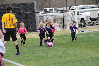 Today both girls had their first soccer games of the Spring season! Sofia has been practicing with her team, the Pink Pirates, on Thursday afternoons for just over an hour for a few weeks now. There are several new players of the team and it's been great seeing all the kids and parents who we've known from when Sofia used to play with the team. The new girls and parents also seem to be great fit and very nice. Olivia joined Purplicious, which is coached by the dad of one of Sofia's classmates who has a little sister just a little younger than Olivia, named Harper. Olivia had her first practice with her new team on Tuesday for 30 minutes directly after Sofia's piano lesson, so we were maybe 10 minutes late.