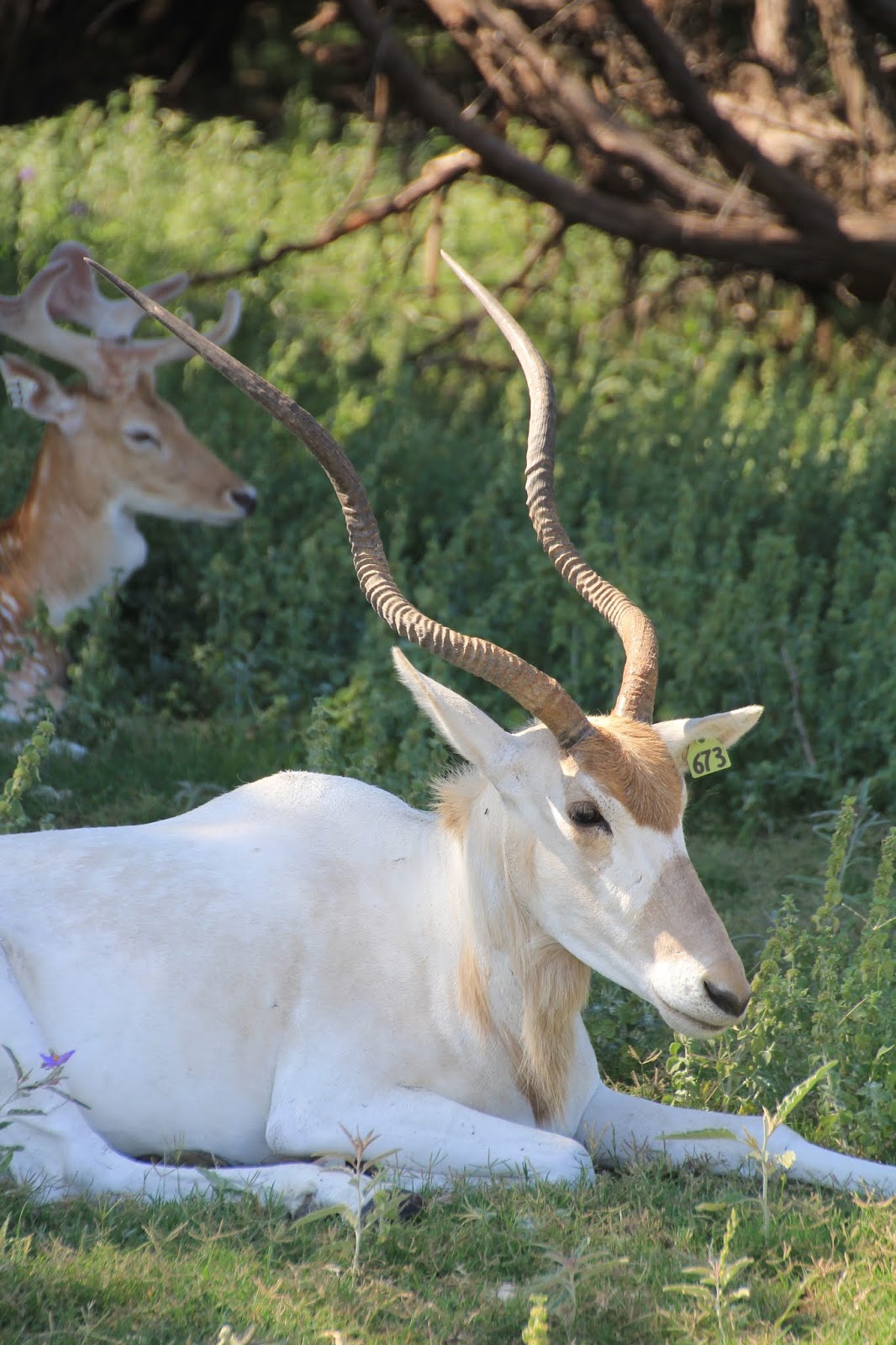 The drive was 1.5 hours and went smoothly. Both girls read their books and Olivia would tell me funny stories in her Magic Tree House books as she read. At one point, she said "Mom, did you know Venice, Italy is timeless?" so I asked her what that meant and she said "It means none of the clocks are right." Ha! I love it! We finally arrived at Fossil Rim and were there just 30 minutes after they opened. Part of the reason I wanted to get going early, was I knew with the hot day we would have a better chance of seeing the animals in the coolest part of the day and we also had plans to host our friends Chad and Desiree and their boys at our house for dinner at 6pm so we really needed to pack it all in. We paid our entrance fee and bought a bag of animal feed, and headed for the entrance. Since our last visit, the entrance has changed and they repaved all of the roads. Because of this, the route is slightly different and we no longer drive up to one of my very favorite vistas. But it was still a great drive. We drove through fields of Addax and Gazelles and tried to feed them. None of them were interested in the first field, but there were several in the second field who would come right up to us. We ended up behind two other cars, so we had to wait our turn, but the animals didn't fill up and were eager to take pellets from us. Of course, both girls really wanted to pet the animals, which they prefer you don't do, but they both were able to touch an Addax. Later we fed Blackbucks and Axis Deer and even a few White Tailed Deer that obviously figured out that living at Fossil Rim provided a lot of free food.