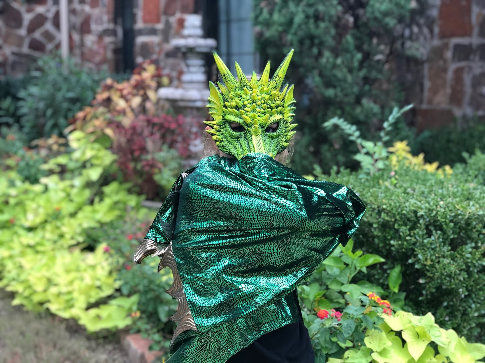 Finally, I kept asking and they agreed that they wanted to be dragons (big surprise)! So, I searched out options online and found dragon capes at Target and some pretty cool dragon masks from an online Halloween store. The girls agreed that they wanted to be green dragons, so I ordered the capes and black boots from Target and the green dragon masks from the Halloween store. The girls both had long-sleeved black shirts and black leggings, which they wore under the capes.